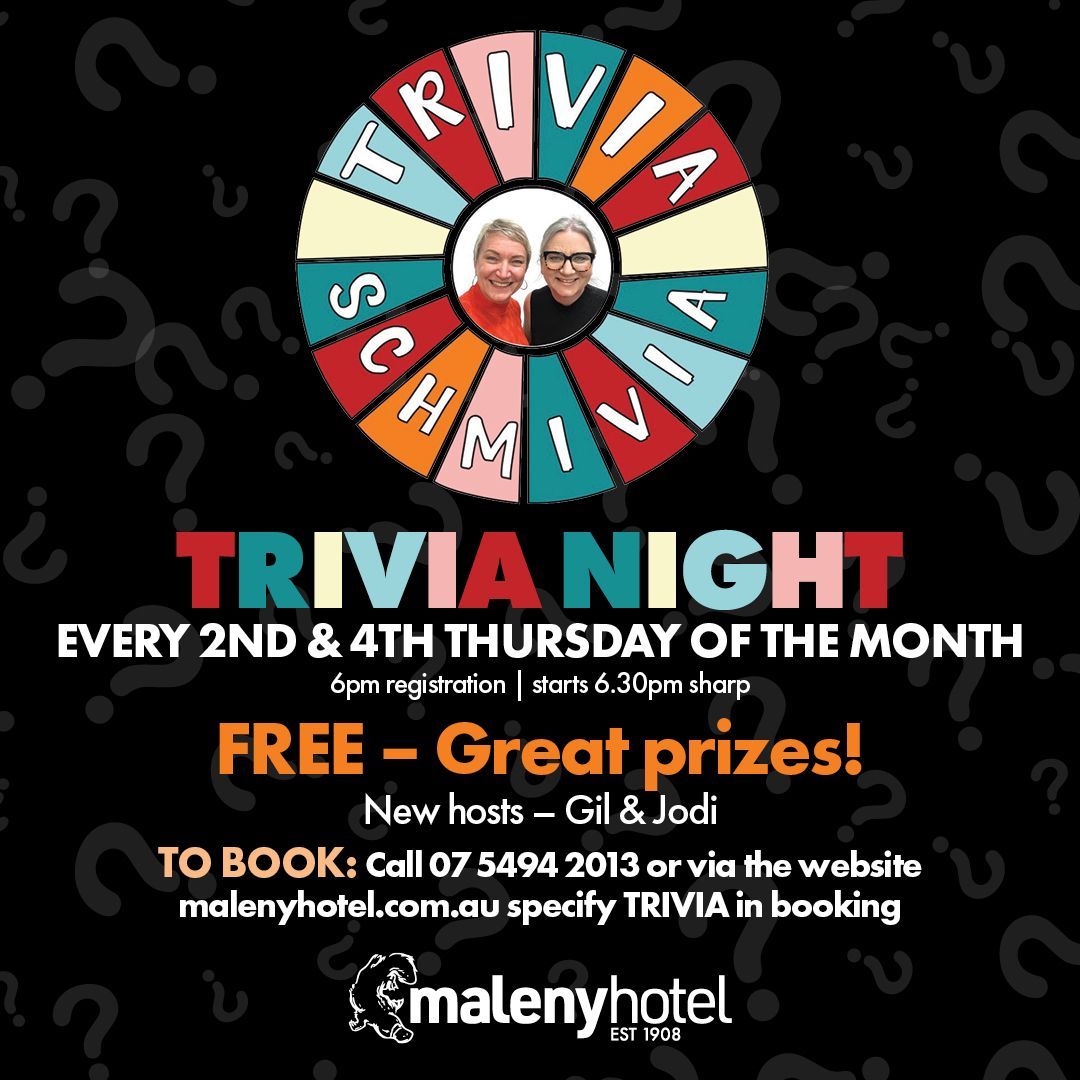 Trivia Schmivia is shaking things up at Maleny Hotel every 2nd and 4th Thursday. It's Trivia, but not as you know it, with music rounds, quirky questions, Wheel of Trivia and great prizes!